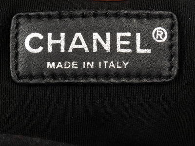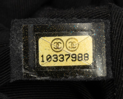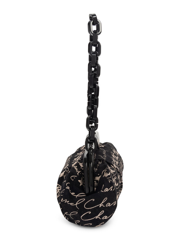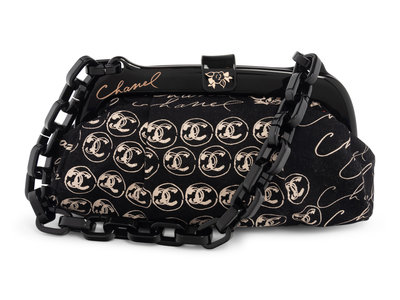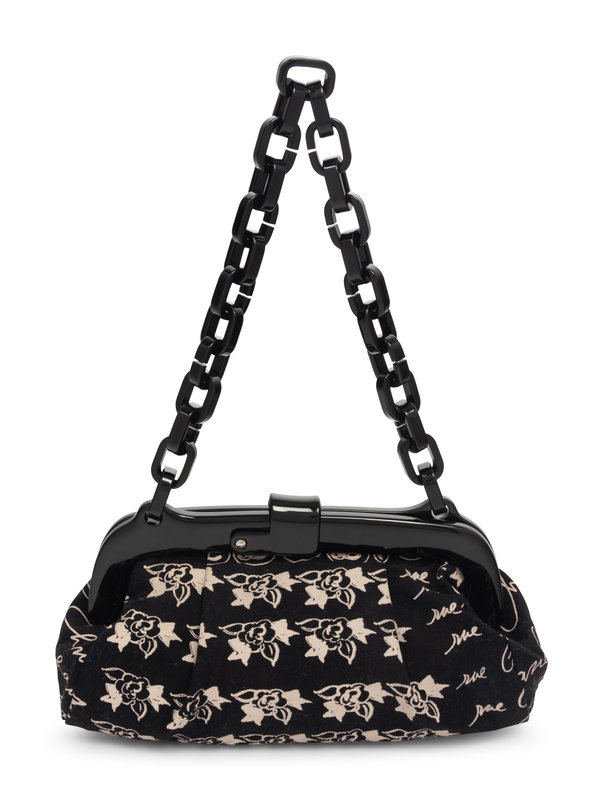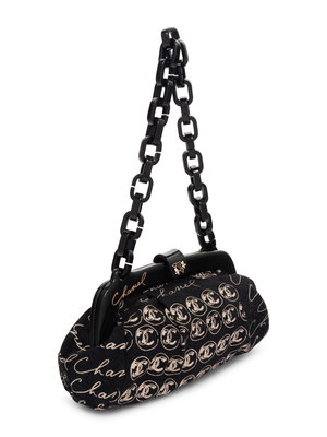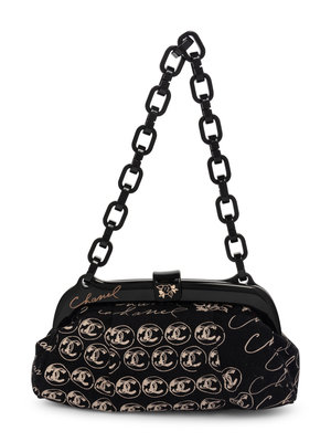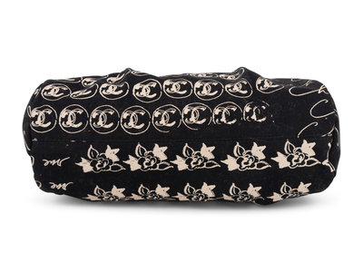 Black with ivory floral and CC logo print canvas hand bag with black acrylic frame and chain strap, and top hinged clasp.