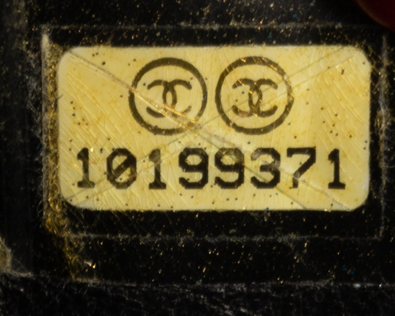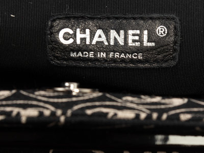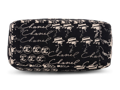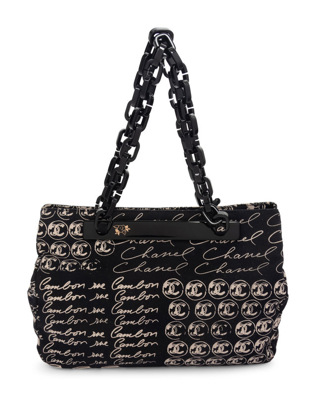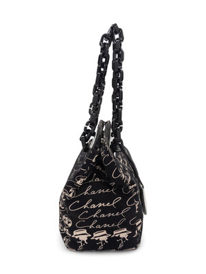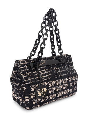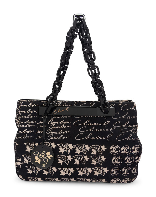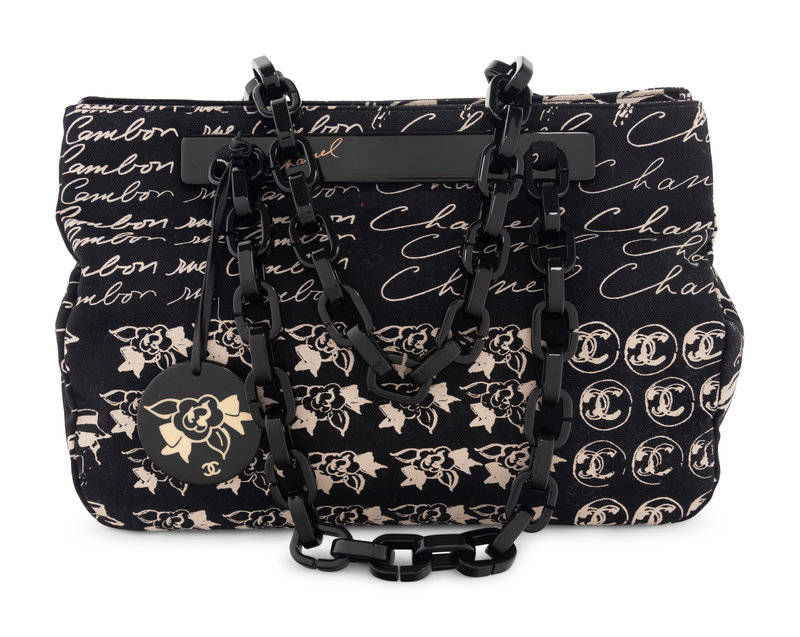 Black printed canvas tote bag with black acrylic chain link handles, mirror, and snap top closure.