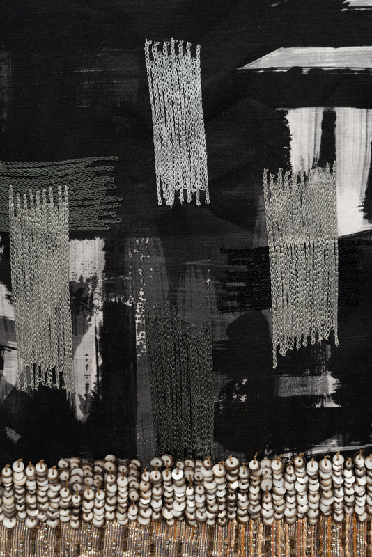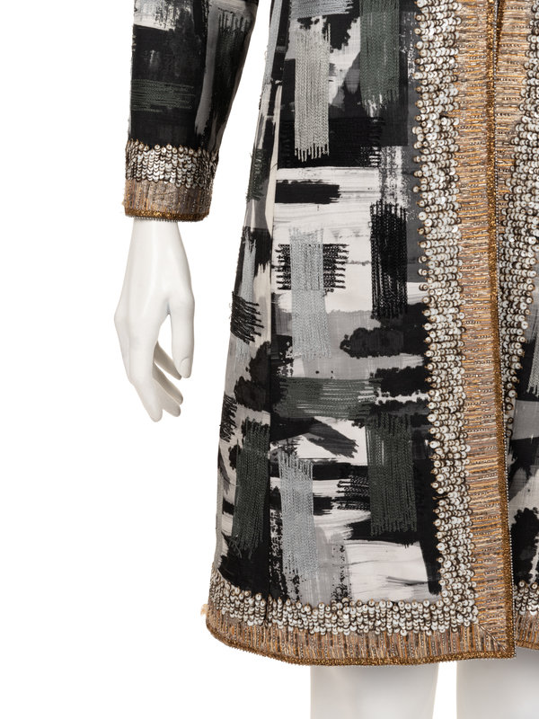 Black, white, and grey wool/silk blend brush stroke print jacket with gray and black chain stitch embroidery and white and gold sequin and beaded embellished trim, long sleeves, and front hook and eye closure. Pre-Fall 2012.