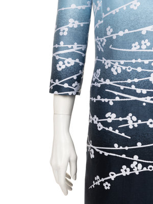 Blue ombré cotton blend jacquard long sleeve jacket with white flower and branch detail, clean neckline, and open front. Resort 2020.