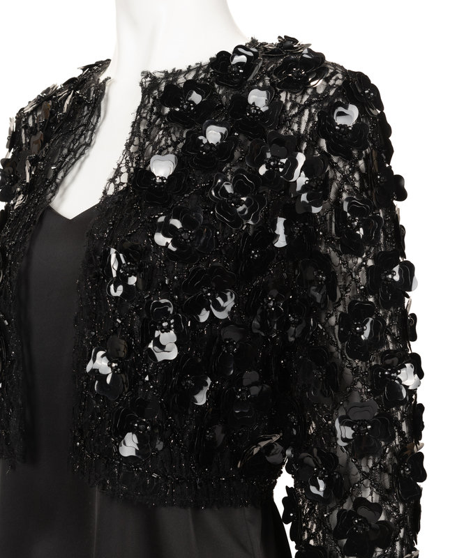 Black net crop open front jacket embellished with black paillettes and beading in floral motif.