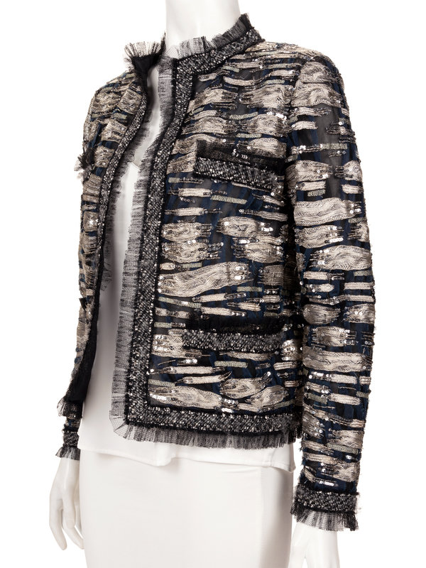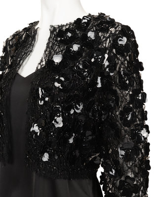 Black silk net crop open front jacket embellished with blue fabric strips, silver sequins and thread detail, and black net trim. Fall 2010.