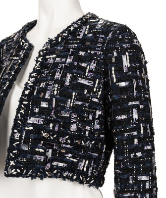 Navy blue cotton polyester blend tweed crop open front jacket with beaded embellishments, printed plastic paillettes, and faux front pockets. Pre-Fall 2011.