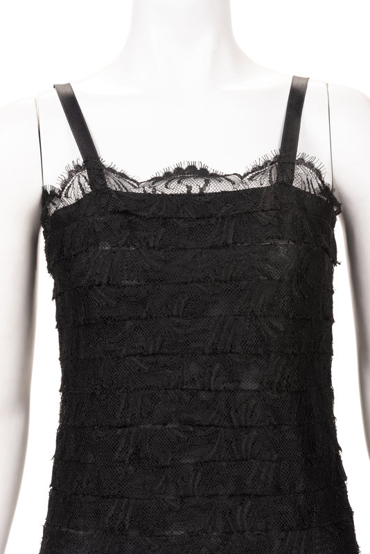 Black silk banded lace sleeveless dress with paneled lace and mesh finished hemline and center back zipper closure.