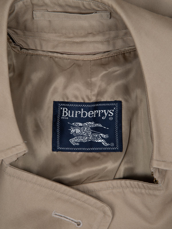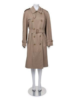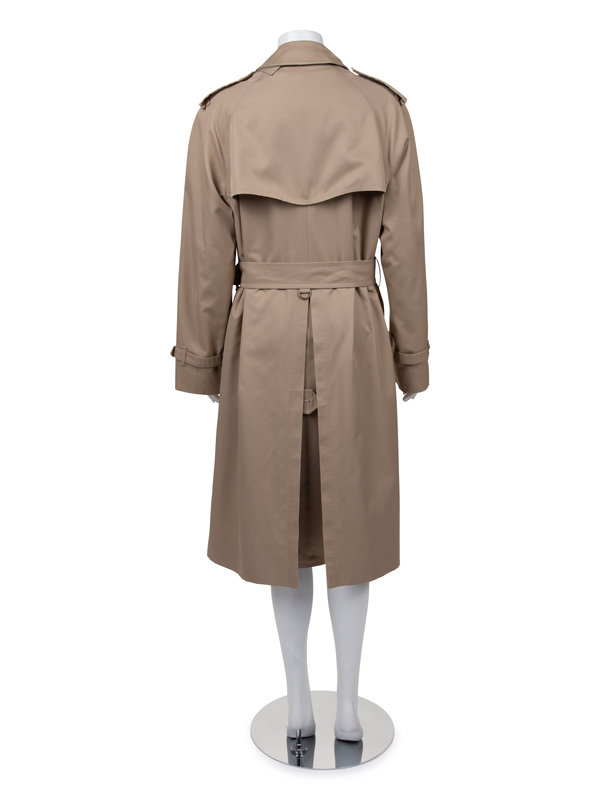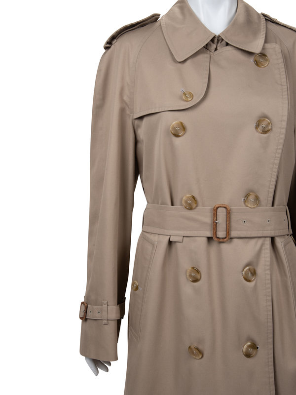 Khaki cotton twill double breasted trench coat with a convertible collar, shoulder epaulets into long sleeves with wrist buckles, two hip welt pockets, a detachable matching belt and detachable lining, and front button closure.