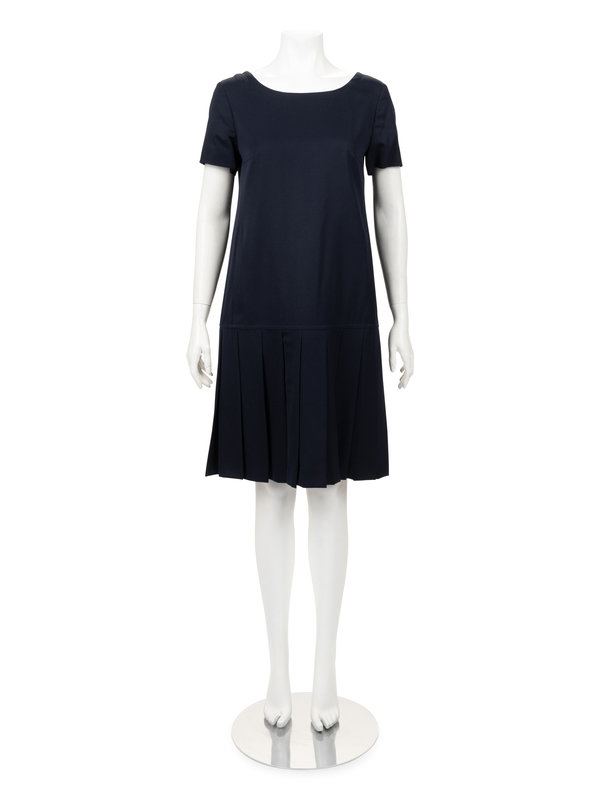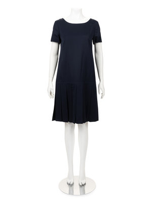 Navy wool two-piece dress ensemble including a a long sleeve box cut jacket with clean neckline, faux pockets, front button closure and back cinch; paired with matching dropped waist short sleeve dress with large skirt pleats and center back zipper closure.