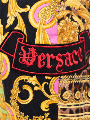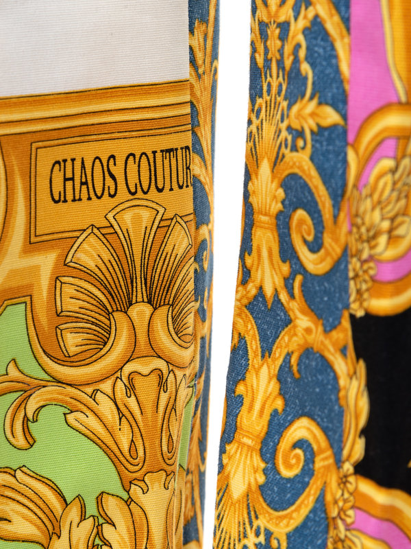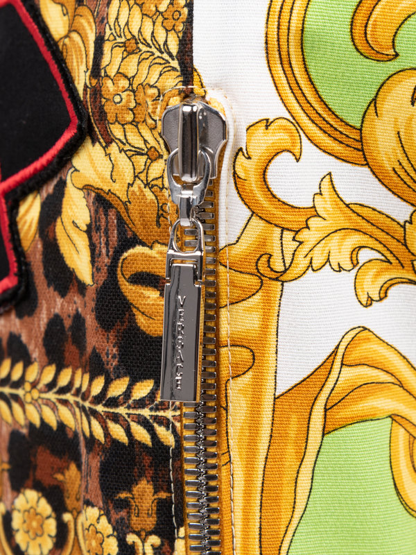 Multi-pattern baroque print cotton/spandex blend flared hem pants with large patch, two front zippers, a zipper down the back and two zippers at the cuffs.