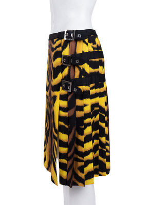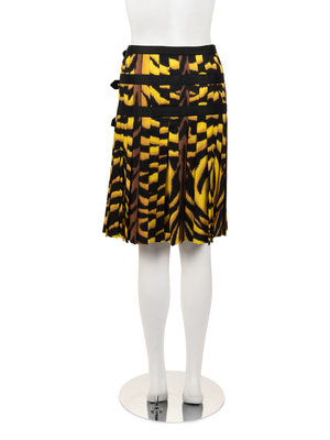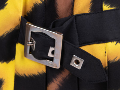 Yellow, brown, and black animal print silk/spandex blend pleated skirt with two horizontal black bands around the back, a slit on the left side, and three side buckles.