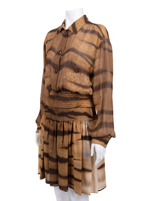 Brown zebra print crepe two-piece skirt ensemble including a cropped long sleeve blouse with convertible collar, cuffed full sleeves, and front button closure; paired with matching pleated short skirt with wide elastic waistband.