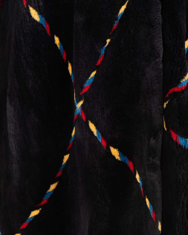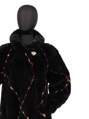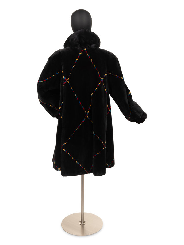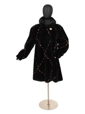 Black sheared beaver fur coat with primary color stripe pattern, asymmetrical buttoned neckline closure with rolled collar, full cuffed long sleeves, and swing hemline. "Maureen" monogrammed on interior front right lining.