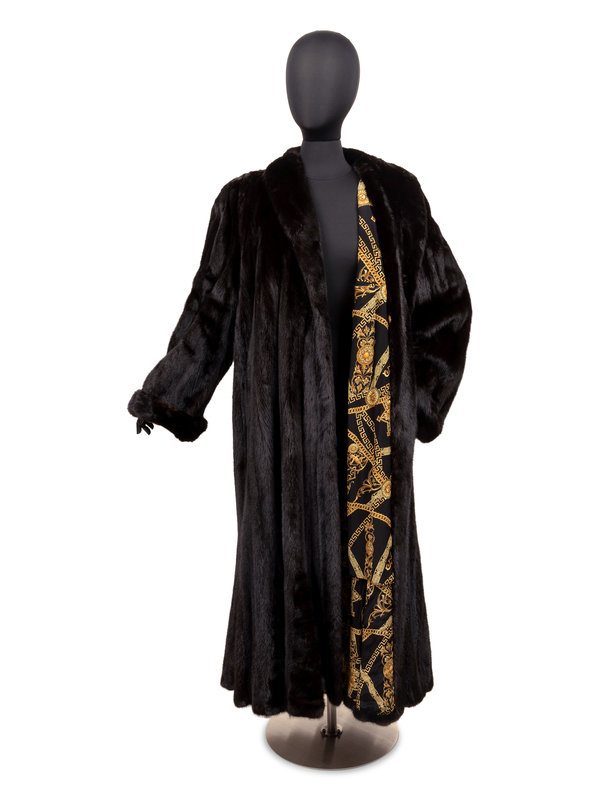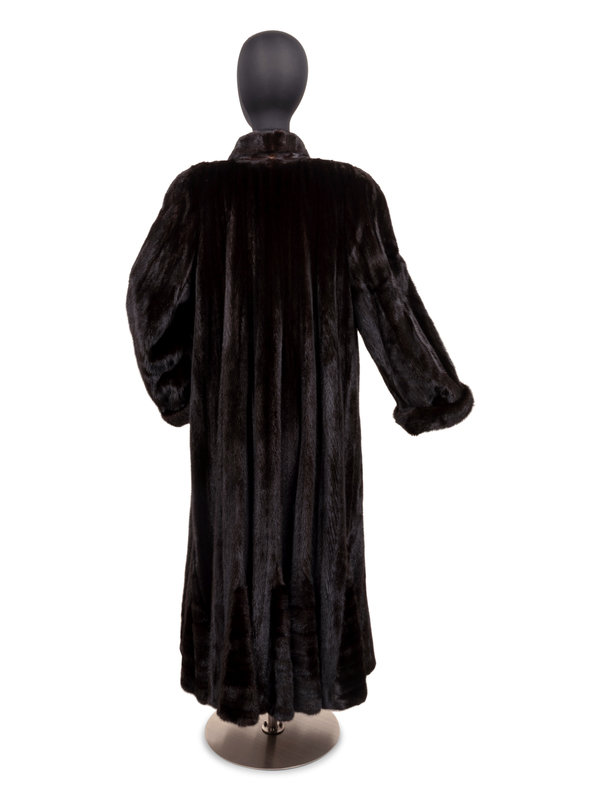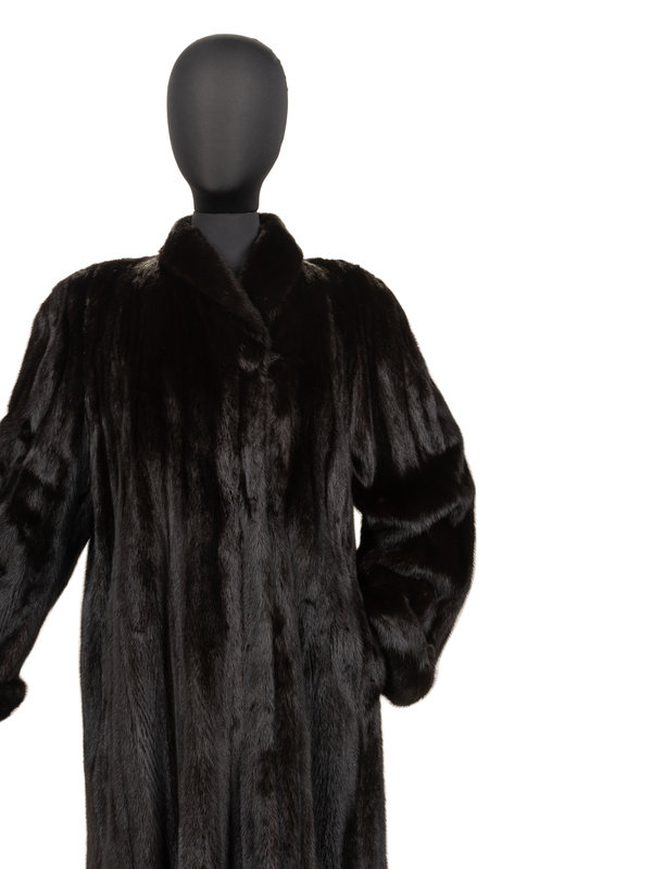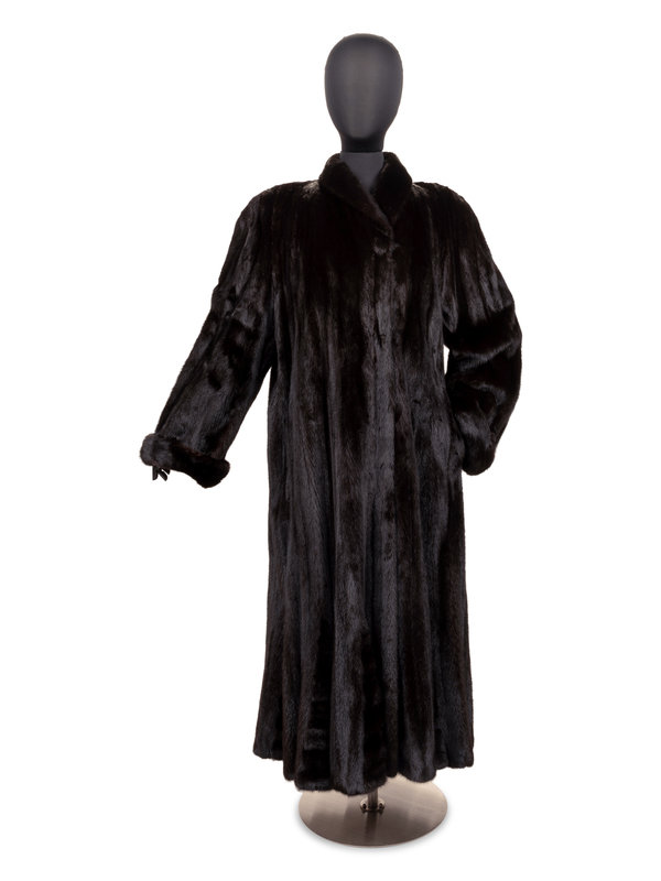 Long black mink fur coat with exaggerated shawl collar, cuffed long sleeves, flared hemline, and front hook and eye closure.