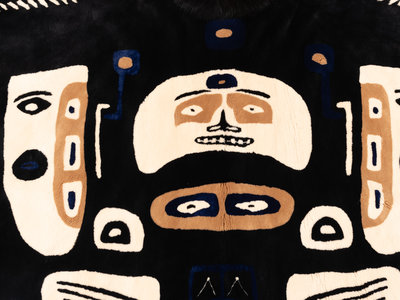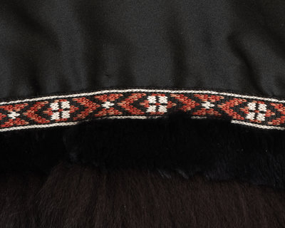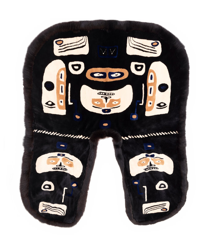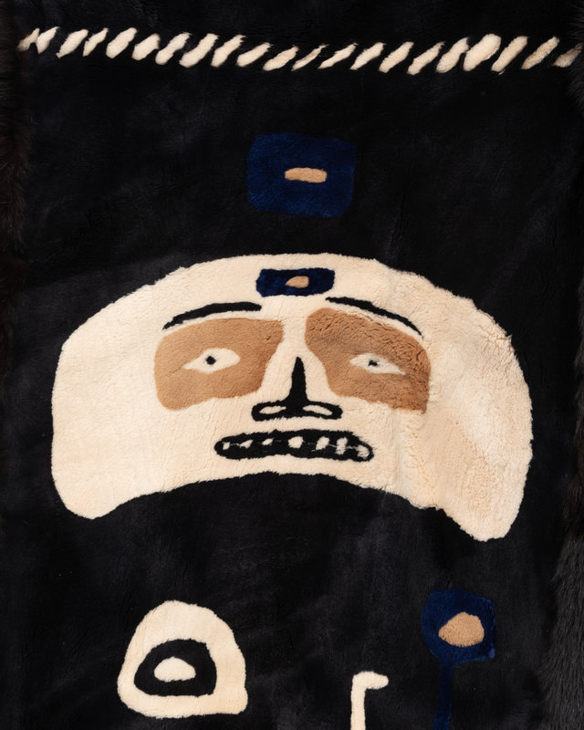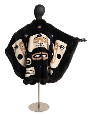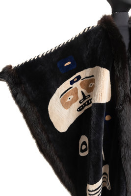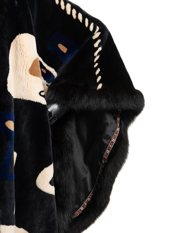 Black sheared mink fur cape with pieced totem faces and symbols in white, tan, blue, and black, and trimmed with black fox fur around the neckline and hem, and front hinged clasp closures.