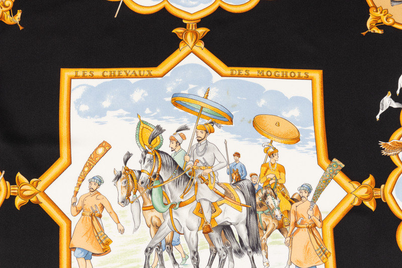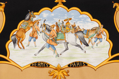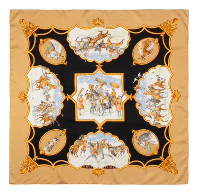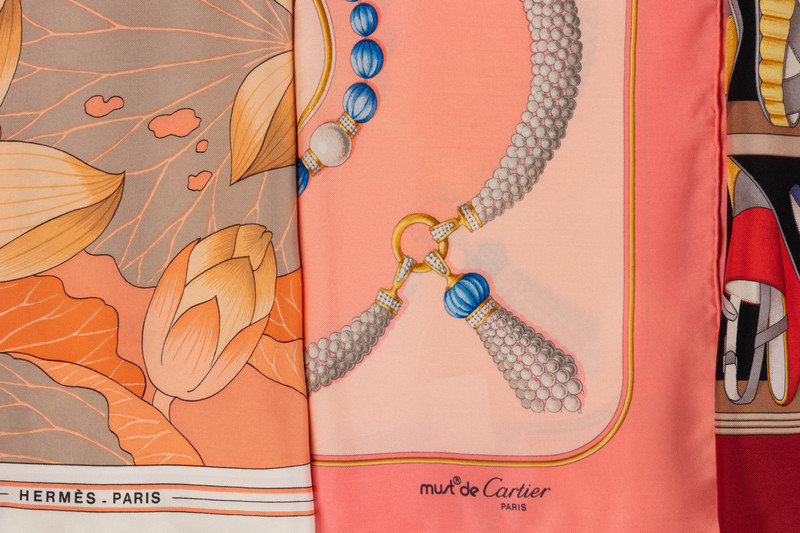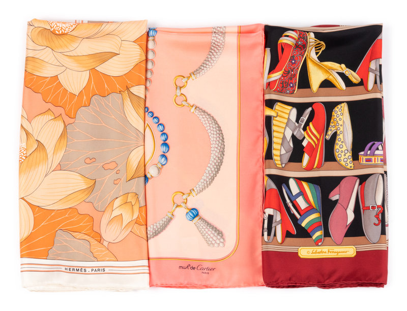 Five Designer Scarves: Three Hermès, One Ferragamo, and One Cartier, 1980-2000s