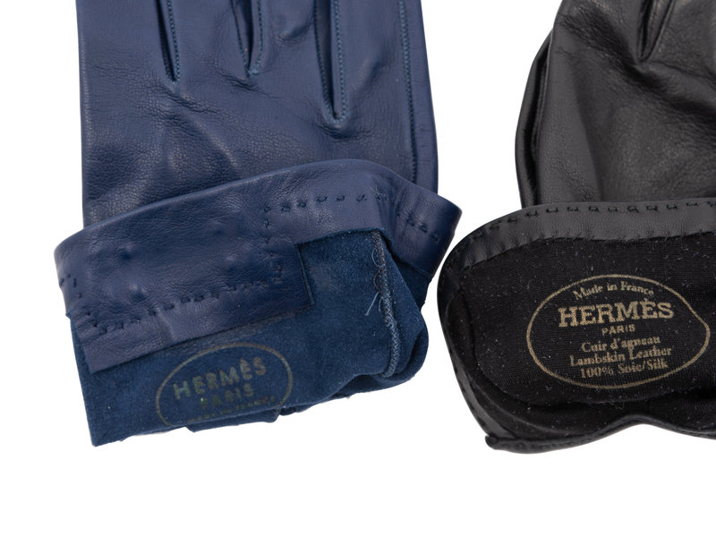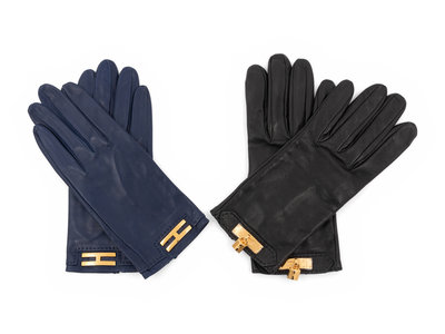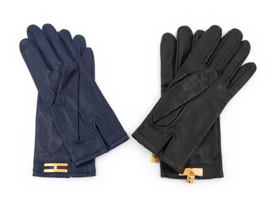 Blue leather wrist length gloves with gold-tone H wrist detail.