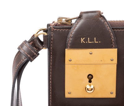 Brown leather zippered portfolio with internal leather slip pockets and front lock zipper pull. K.L.L. stamped onto zipper pull.