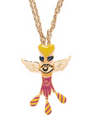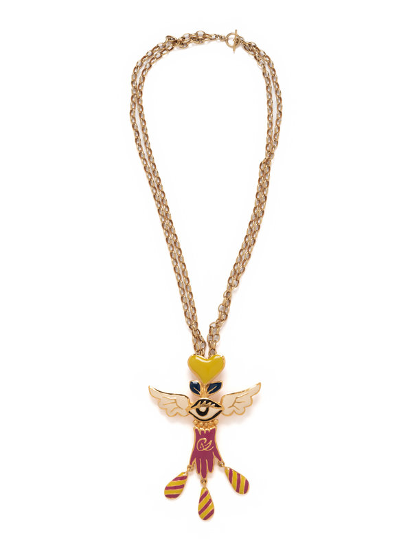 Citron, cream, blue, and fuchsia enamel laid winged eye and hand pin on gold-tone metal double chain necklace.