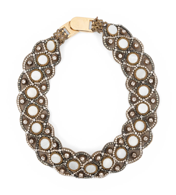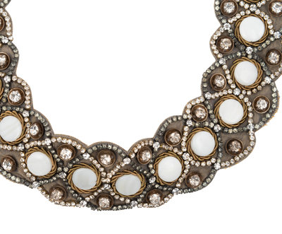 Silver-thread mesh wreath necklace embellished with gray and silver rhinestones, white circular beads, brass coil braid, and back magnetic closure.