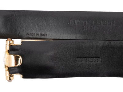 Black satin and leather adjustable belt with gold-tone metal Art Deco style buckle set with golden rhinestones.
