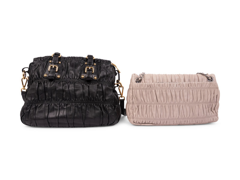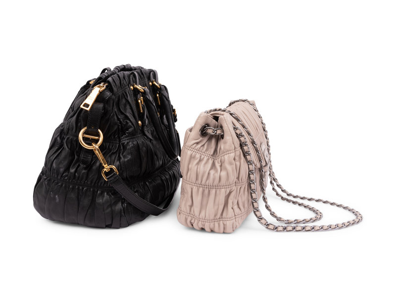 Pomice nappa gathered leather Gaufre chain flap shoulder bag with silver-tone metal chain shoulder strap, an outer back snap pocket, a front snap closure, an interior zipper pocket, and one slit pocket.