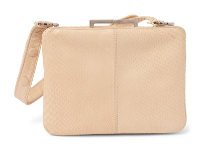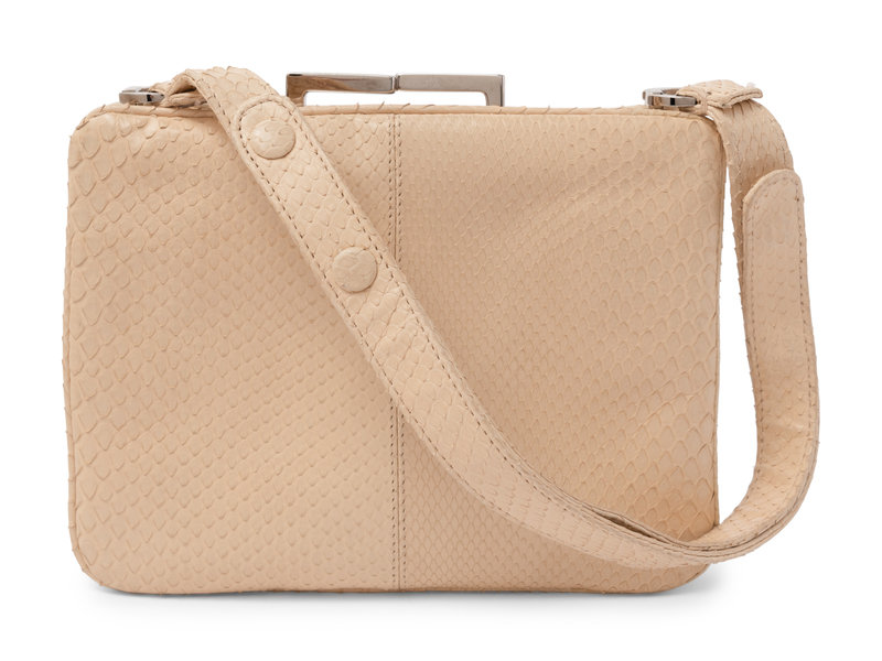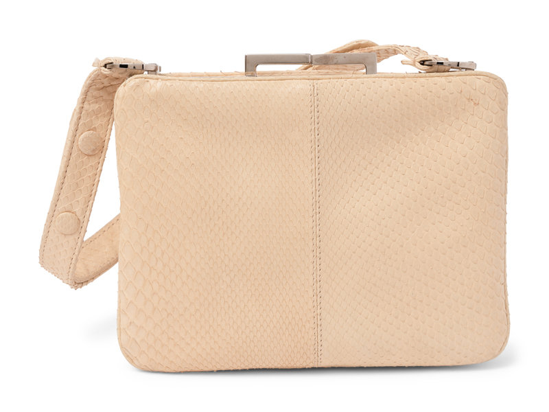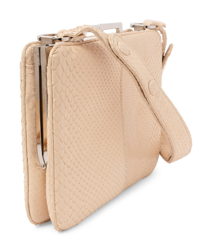 Ivory python frame handbag with silver-tone metal hardware, adjustable top handle, and twist kissing clasp closure.