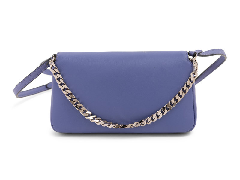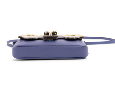 Light purple leather micro monster baguette bag with yellow feather and plush detailed eyes, rhinestone and faux pearl embellishments, detachable shoulder strap and handle, and front magnetic snap closure. Found with original sales tag, price not included.