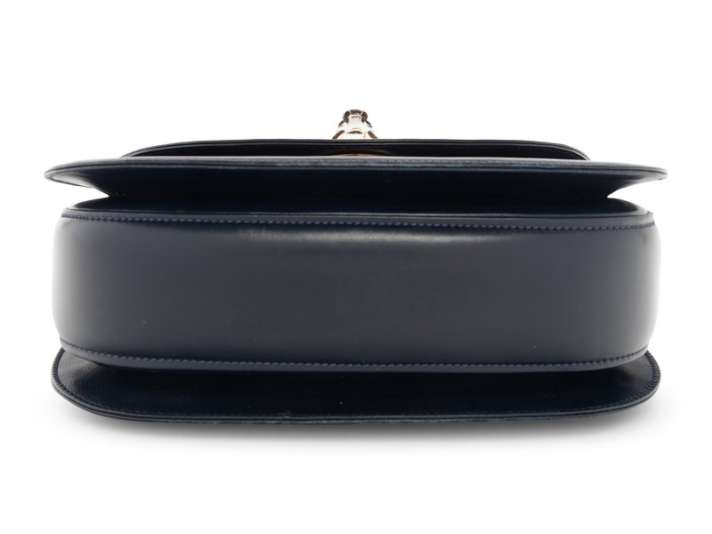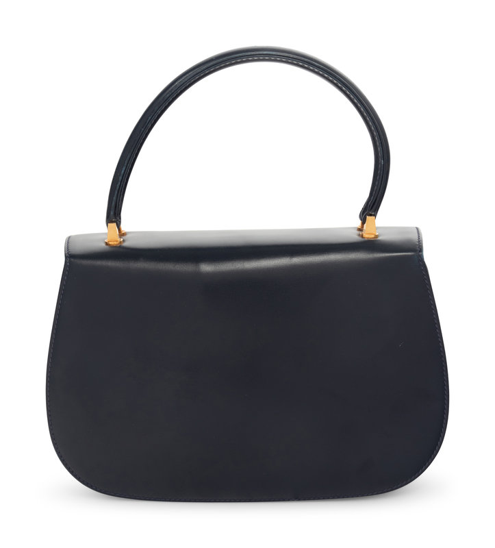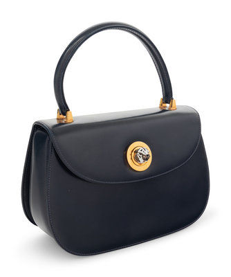Navy leather flap hand bag with top handle and front twist lock closure.