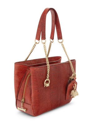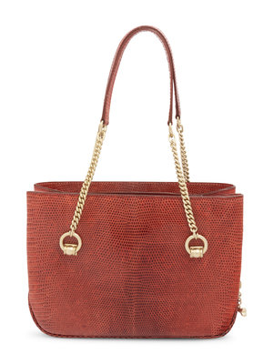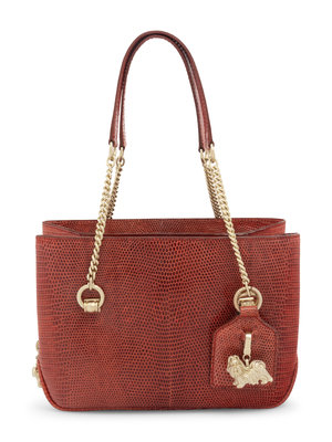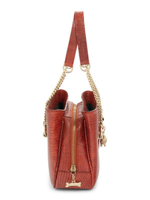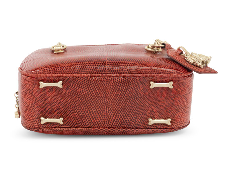 Brown lizard skin three compartment bag with gold-tone dog tag and bone feet, skin and chain handle, and center zippered closure.