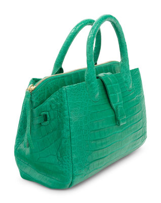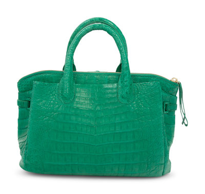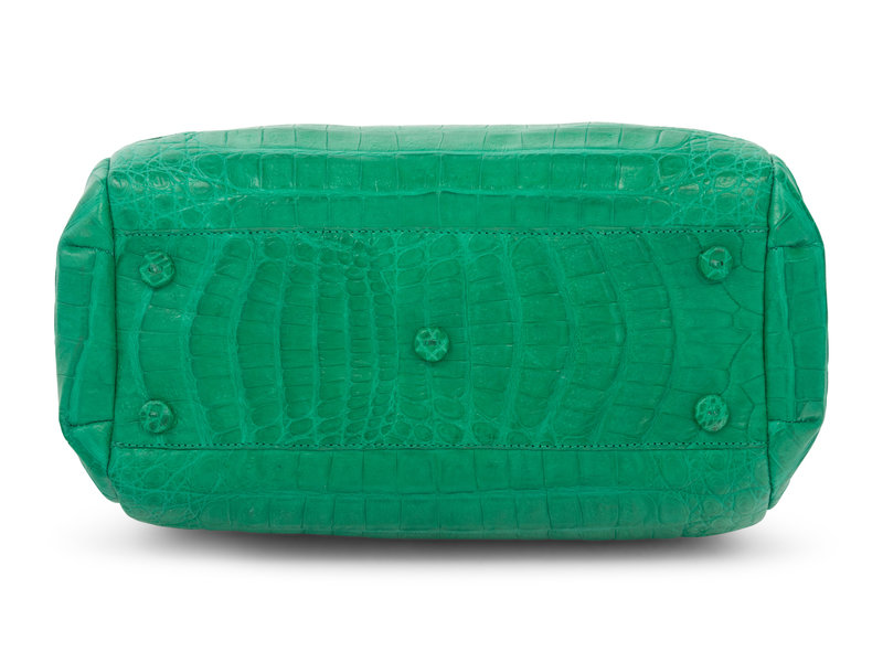Green crocodile skin three compartment hand bag with dual top rolled handles, front and back magnetic closures, and center zippered pouch.