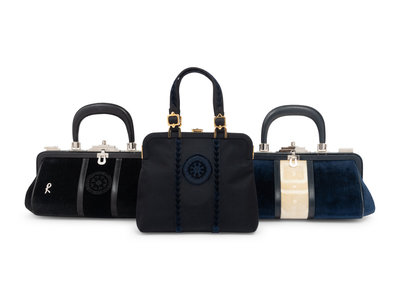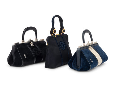 Blue satin weave frame bag detailed with blue velvet floral pattern, top satin and velvet handles, gold-tone metal hardware, and top hinged clasp closure.