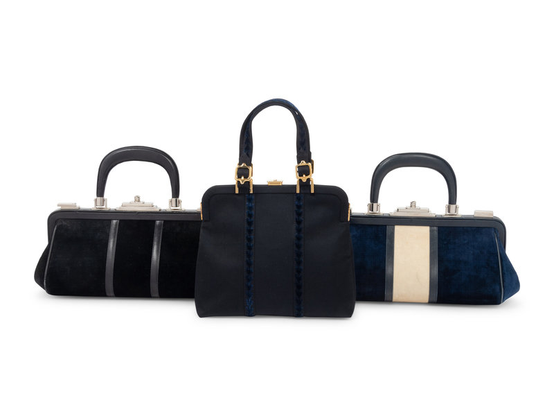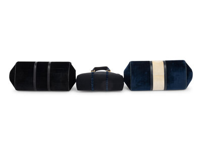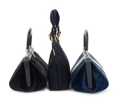 Blue and white velvet baguette frame bag trimmed with blue leather, silver-tone hardware, top leather handle, and top slide clasp closure.