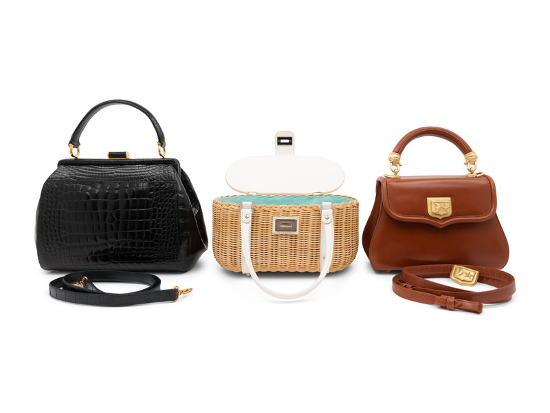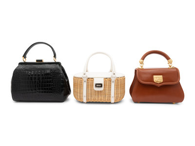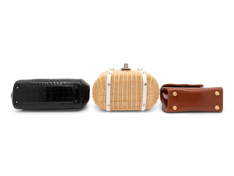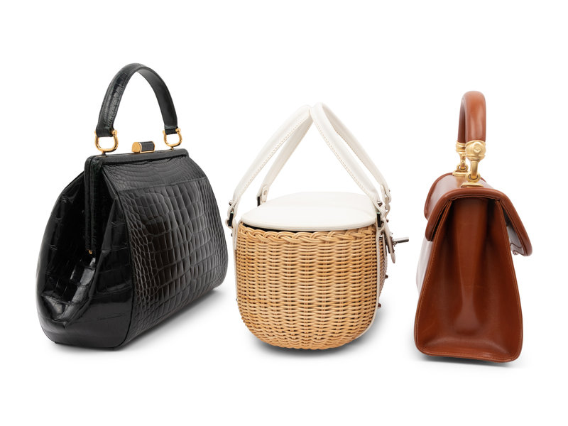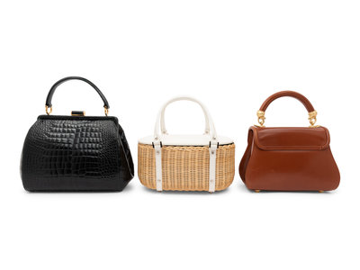 Woven cane handbag with white leather top and handles, and front flap lock closure.