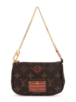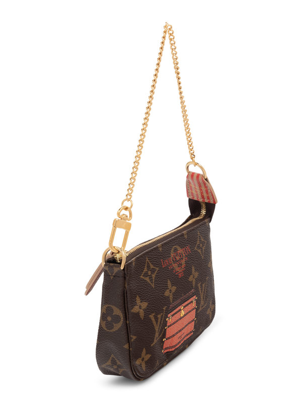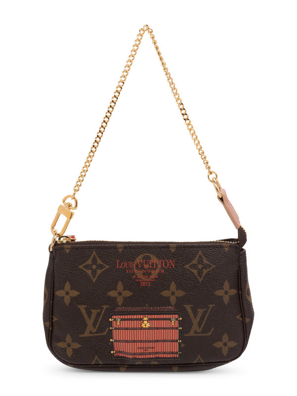 Louis Vuitton Mini Pochette Monogram Inventeur bag on gold-tone metal chain, printed with trunk image, and top zipper closure.