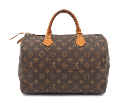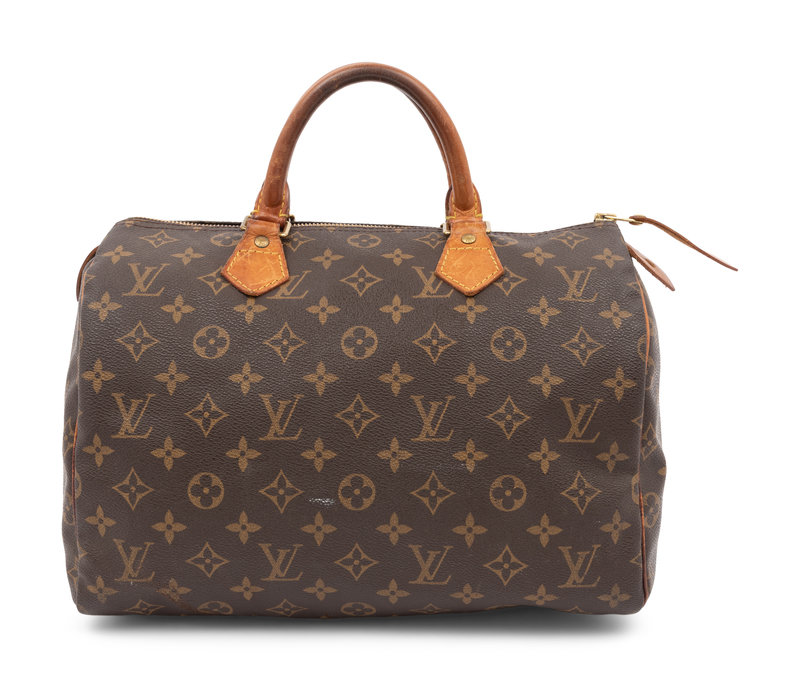 Louis Vuitton Monogram Speedy handbag with dual top rolled leather handles and top zipper closure.