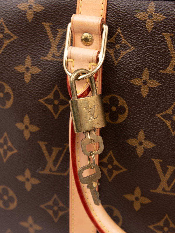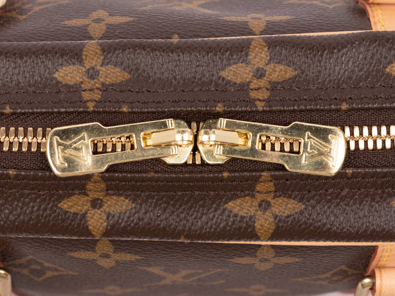 Louis Vuitton Porte Documents Voyage in Monogram coated canvas with two top handles, an interior zip pocket, three slip pockets, a small pocket with key ring, and a top zipper closure.