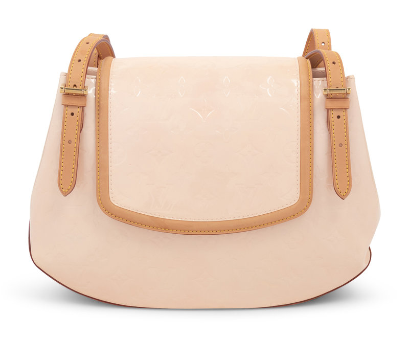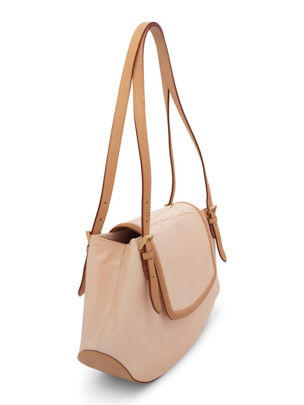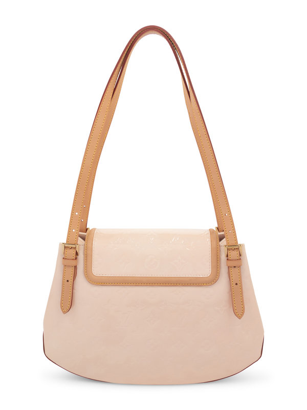 Marshmallow pink Biscayne Bay GM bag in monogram vernis with adjustable leather straps, top flap, and front magnetic snap closure.