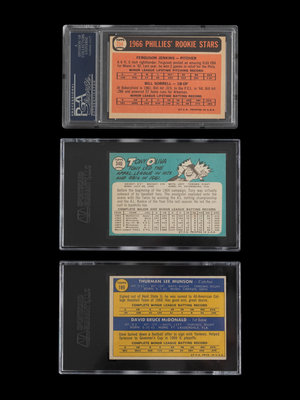 comprising 1965 Topps Tony Oliva No. 340 (SGC 7 NM), 1966 Topps Fergie Jenkins No. 254 (PSA 6 EX-MT), 1970 Topps Thurman Munson No. 189 (SGC 6.5 EX-NM+)