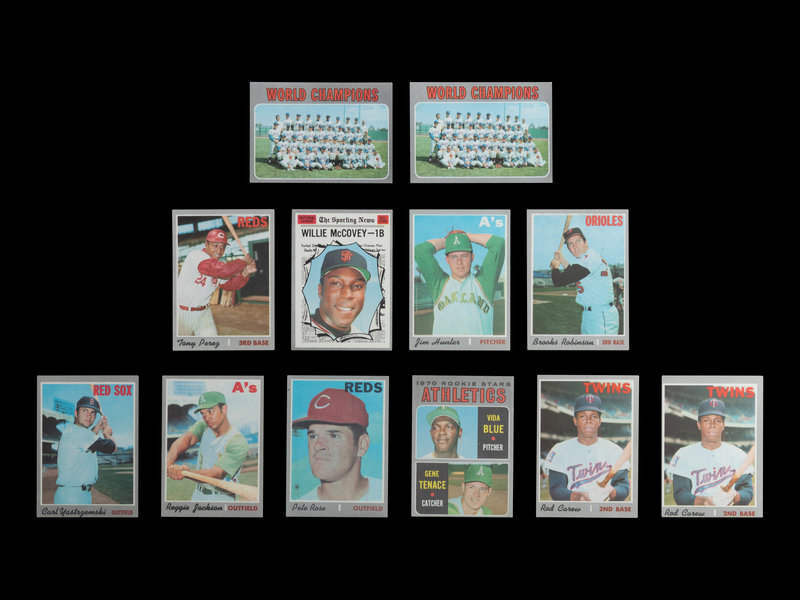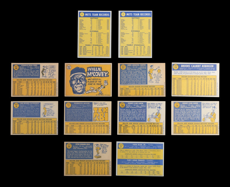 comprising New York Mets World Champions (No. 1) x2, Carl Yastrzemski (No. 10), Athletics Rookie Stars (No. 21), Reggie Jackson (No. 140), Brooks Robinson (No. 230), Rod Carew (No. 290) x2, Tony Perez (No. 380), Willie McCovey (No. 450), Jim Catfish Hunter (No. 565), Pete Rose (No. 580).