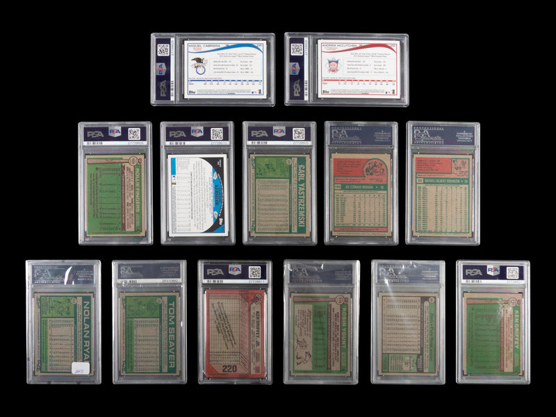 comprising 1975 Topps: Brooks Robinson No. 50 (PSA 7 NM), Joe Morgan No. 180 (PSA 7 NM); 1976 Topps: Ken Griffey No. 128 (PSA 8 NM-MT), Robin Yount No. 316 (PSA 7 NM), Rollie Fingers No. 405 (PSA 7 NM); 1977 Topps: Tom Seaver No. 150 (PSA 6 EX-MT), Carl Yastrzemski No. 480 (PSA 8 NM-MT), Nolan Ryan No. 650 (PSA 7 NM); 1979 Topps: Pete Rose No. 650 (PSA 8 NM-MT); 1989 Bowman: Ken Griffey Jr. No. 220 (PSA 9 MINT); 2009 Topps: Clayton Kershaw No. 575 (PSA 10 GEM MINT); 2014 Topps: Miguel Cabrera No. 335 (PSA 10 GEM MINT), Andrew McCutchen No. 452 (PSA 8 NM-MT).