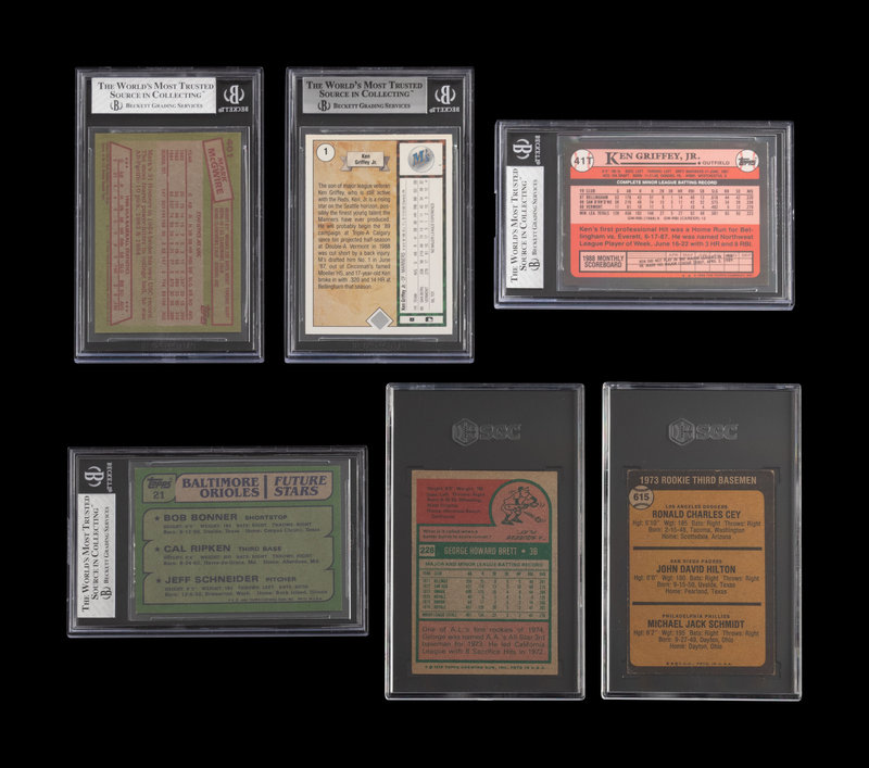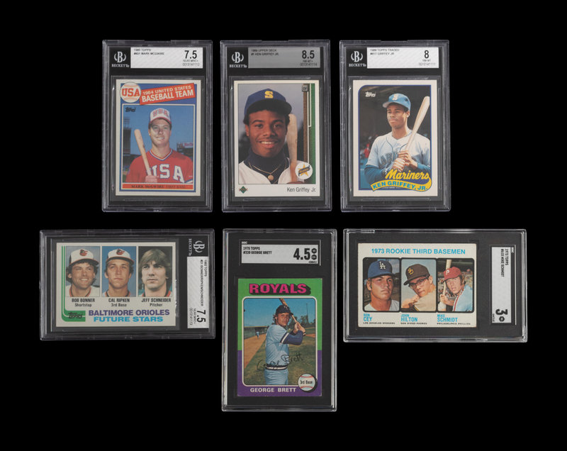 comprising 1973 Topps: Mike Schmidt No. 615 (SGC 3 VG); 1975 Topps: George Brett (SGC 4.5 VG-EX+); 1982 Topps: Cal Ripken Jr. No. 21 (BGS 7.5 NM+); 1984 Topps: Mark McGwire No. 401 (BG 7.5 NM+); 1989 Topps Traded: Ken Griffey Jr. No. 41T (BGS 8 NM-MT); 1989 Upper Deck: Ken Griffey Jr. No. 1 (BGS 8.5 NM-MT+).