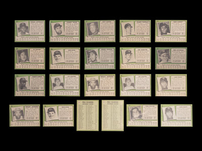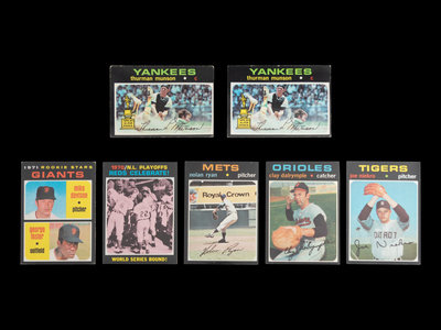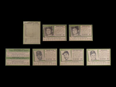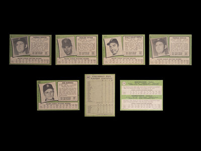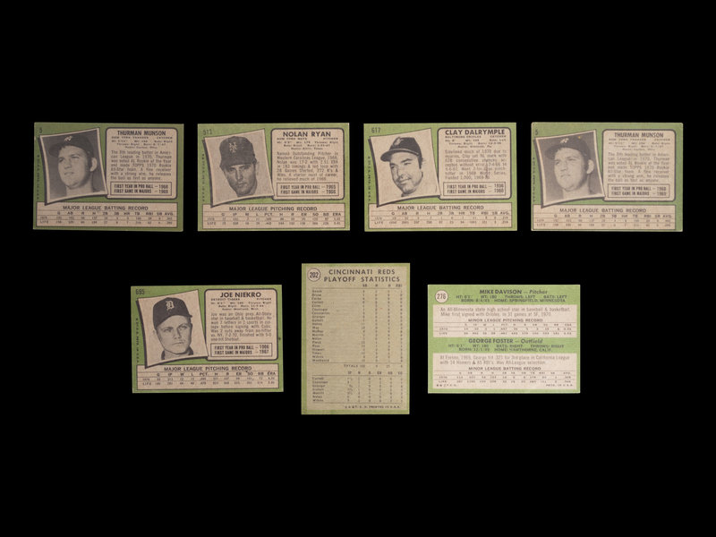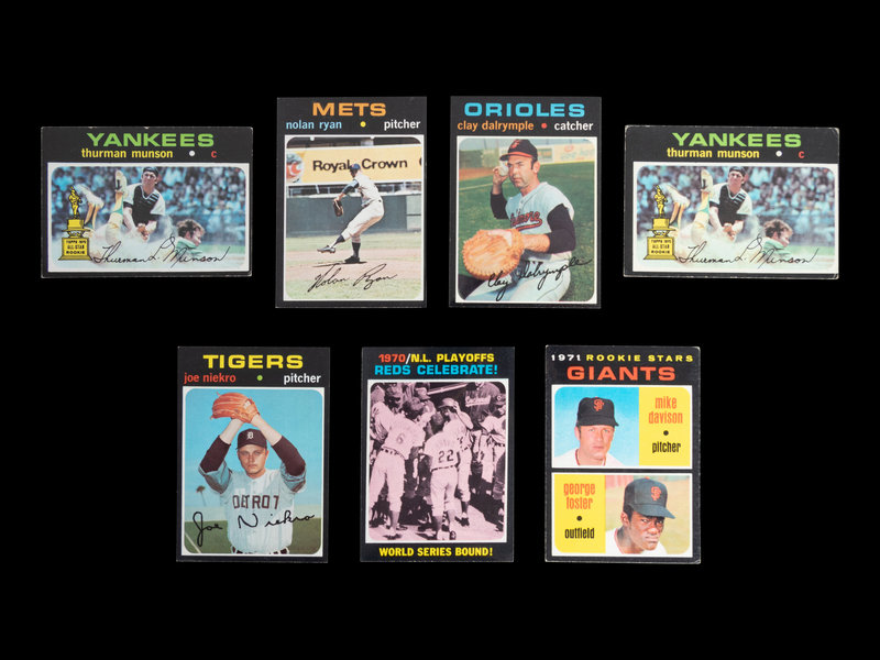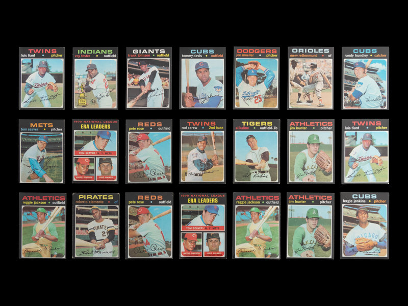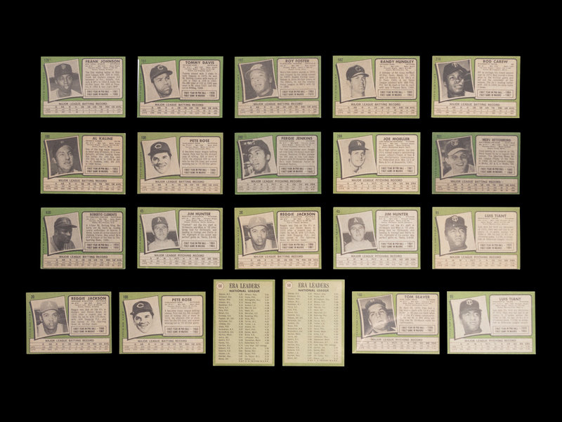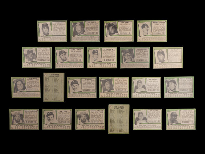 comprising Thurman Munson (No. 5) x2, Reggie Jackson (No. 20) x2, Jim Catfish Hunter (No. 45) x2, 1970 NL ERA Leaders (No. 68) x2, Luis Tiant (No. 95), x2 Pete Rose (No. 100) x2, Roy Foster (No. 107), Frank Johnson (No. 128), Tommy Davis (No. 151), Tom Seaver (No. 160), Al Kaline (No. 180), 1970 NL Playoffs (No. 202), Rod Carew (No. 210), 1971 Giants Rookie Stars George Foster (No. 276), Fergie Jenkins (No. 280), Joe Moeller (No. 288), Merv Rettenmund (No. 393), Nolan Ryan (No. 513), Randy Hundley (No. 592), Clay Dalrymple (No. 617), Roberto Clemente (No. 630), Joe Niekro (No. 695).