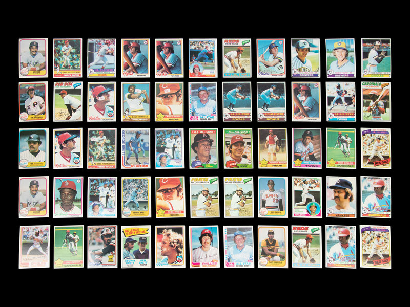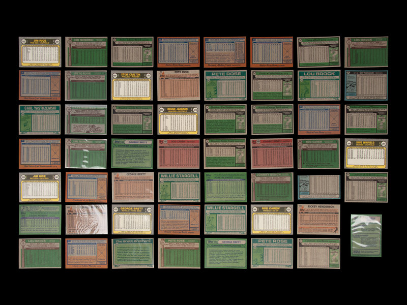 1976 Topps: Lou Brock (No. 10) x2, Dave Winfield (No. 160), Carl Yastrzemski (No. 230) x2, Pete Rose (No. 240) x2, Johnny Bench (No. 300), Rod Carew (No. 400); 1977 TCMA Renata Galasso: Complete Set cards 1-45; 1977 Topps: Johnny Bench (No. 200), Lou Brock (No. 355), Pete Rose (No. 450) x2, Willie Stargell (No. 460) x2, Carl Yastrzemski (No. 480), The Brett Brothers (No. 631); 1978 Topps: Pete Rose (No. 20) x3, Eddie Murray (No. 36), Carl Yastrzemski (No. 40) x2, George Brett (No. 100), Lou Brock (No. 170), Robin Yount (No. 173); 1979 Topps: Paul Molitor (No. 24), Robin Yount (No. 95), Rod Carew (No. 300), Thurman Munson (No. 310), George Brett (No. 330) x2, Eddie Murray (No. 640), Lou Brock (No. 665) x2; 1980 Topps: Carl Yastrzemski (No. 720) x2; 1981 Fleer: Steve Carlton (No. 6), Johnny Bench (No. 196), Dave Parker (No. 36), Tom Seaver (No. 200), Jim Rice (No. 222) x2, Rod Carew (No 268), Willie McCovey (No. 434), Dave Winfield (No. 484), Reggie Jackson (No. 650), George Brett (No. 655), Steve Carlton (No. 660); 1981 Topps: Stolen Base Leaders (No. 4), Rod Carew (No. 100), Ozzie Smith (No. 254), Johnny Bench (No. 600); 1982 Topps: Mike Schmidt (No. 100), George Brett (No. 201), Eddie Murray (No. 390), George Brett (No. 549) x2; 1983 Topps: Pete Rose (No. 100), Rickey Henderson (No. 180), Mike Schmidt (No. 300), George Brett (No. 600) x2.
