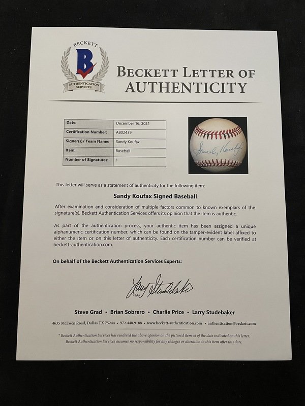 A Sandy Koufax Signed Autograph Baseball (Beckett Authentication Services BAS Certified),