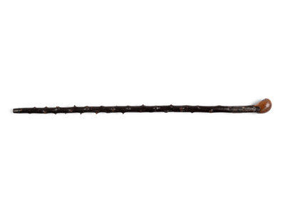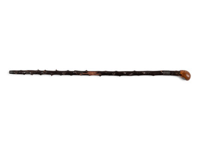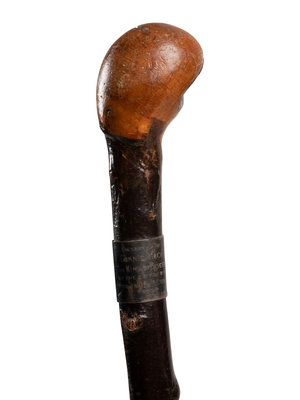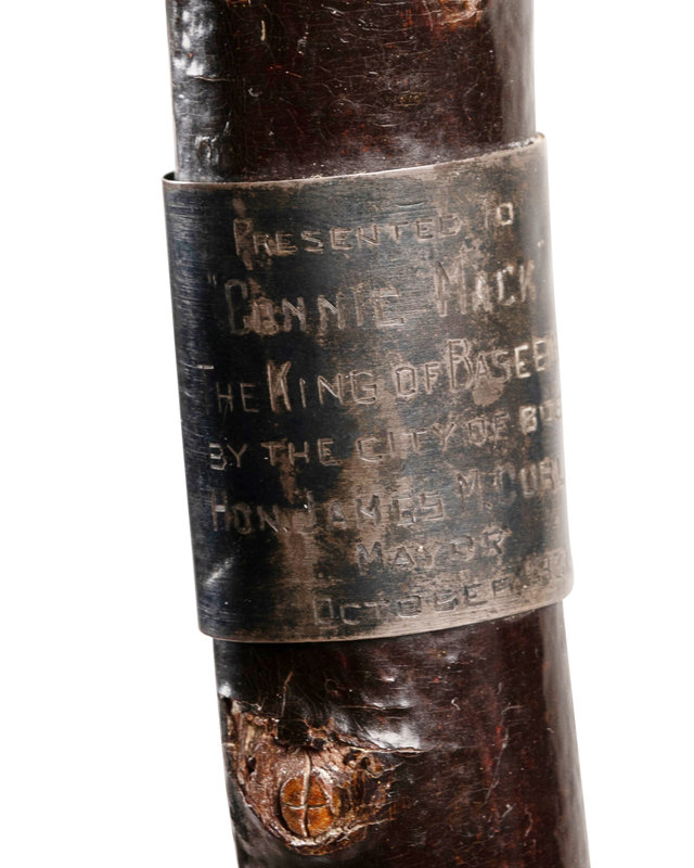Connie Mack, the longest-serving manager in baseball history, managed his final World Series in 1931, when his defending champion Philadelphia Athletics fell to the St. Louis Cardinals in seven games. Although he would go on to manage 19 additional seasons, that 1931 Series would be the last time Mack would lead a team to the Fall Classic. With his place in baseball lore secure, Mack received this elaborate rootwood walking stick from Boston mayor James M. Curley in October 1931 designating him "The King Of Baseball." Mack, a native of East Brookfield, Mass. held a special place in the heart of Boston as he signed the lease for the property that became the site of the Boston Red Sox’ first ballpark. The stick measures 35 inches and features an engraved plaque near the handle that states: