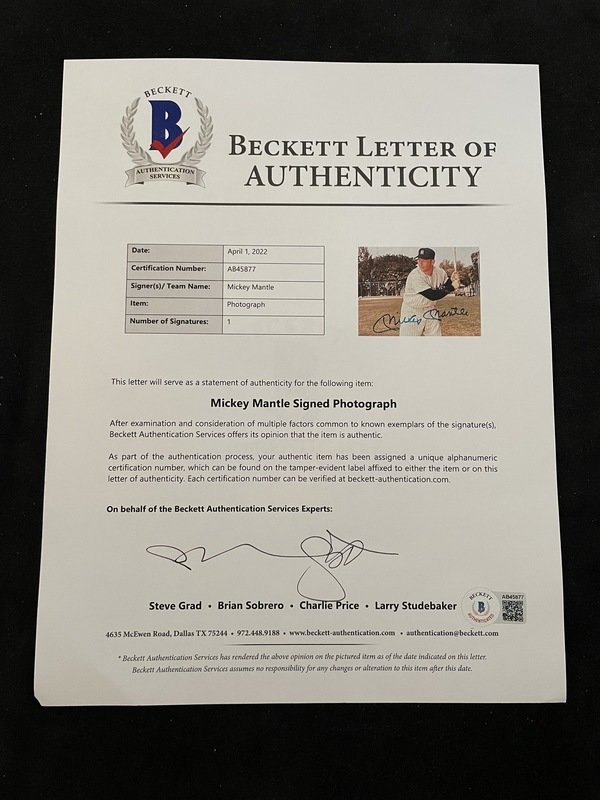 A Mickey Mantle Signed Autograph Photo (Beckett Authentication Services BAS Certified),