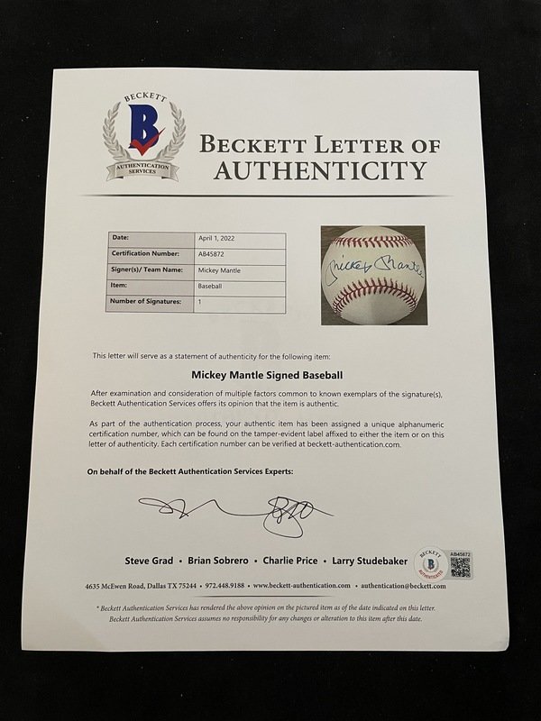A Mickey Mantle Signed Autograph Baseball (Beckett Authentication Services Letter BAS Certified),
