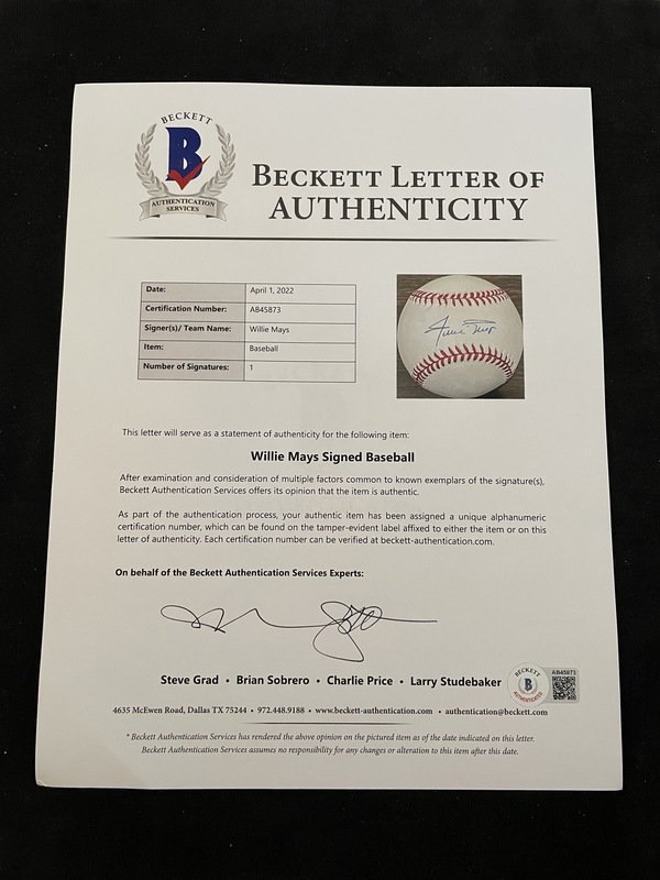 A Willie Mays Signed Autographed Baseball (Beckett Authentication Services Letter BAS Certified),