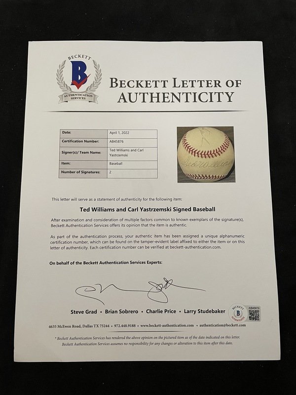 inscribed "Ted Williams" and "Carl Yastrzemski" in black ink.