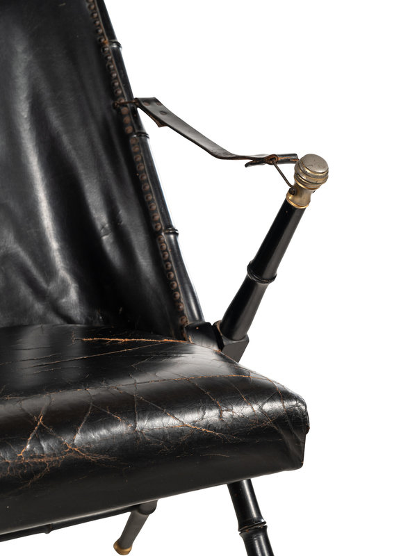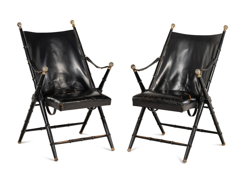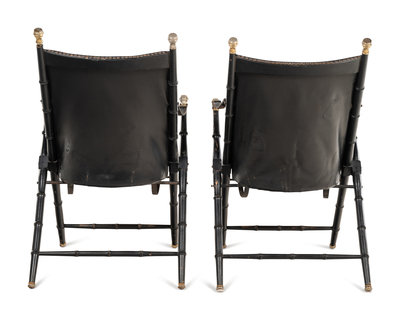 A Pair of Spanish Leather-Upholstered Campaign Folding Chairs by Valenti