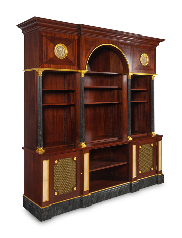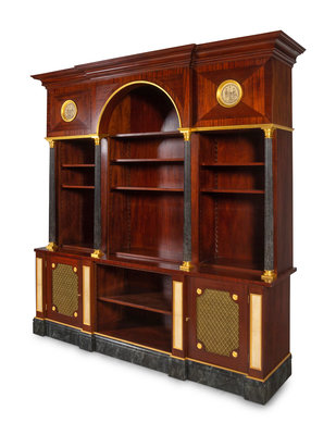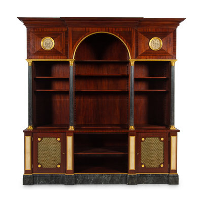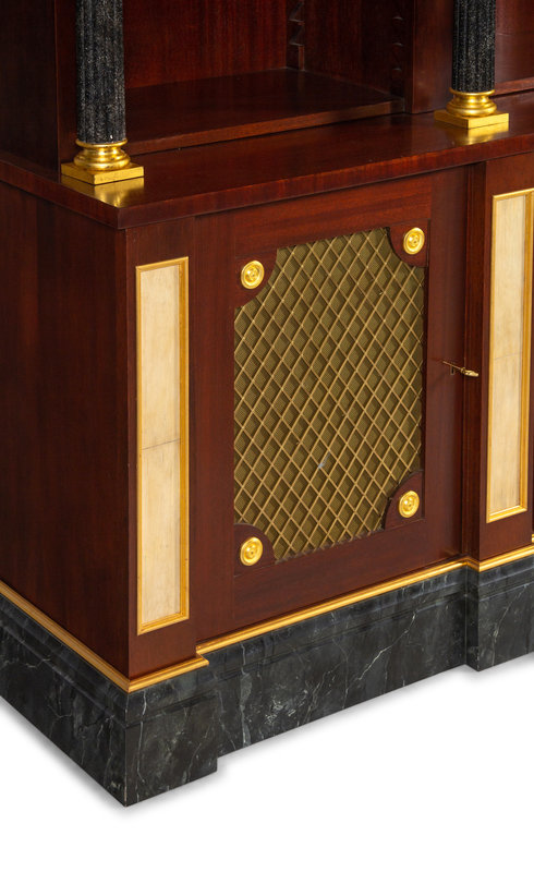 APPROVED FOR DONATION A Neoclassical Style Gilt Metal Mounted Mahogany and Faux Marble Illuminated Bookcase