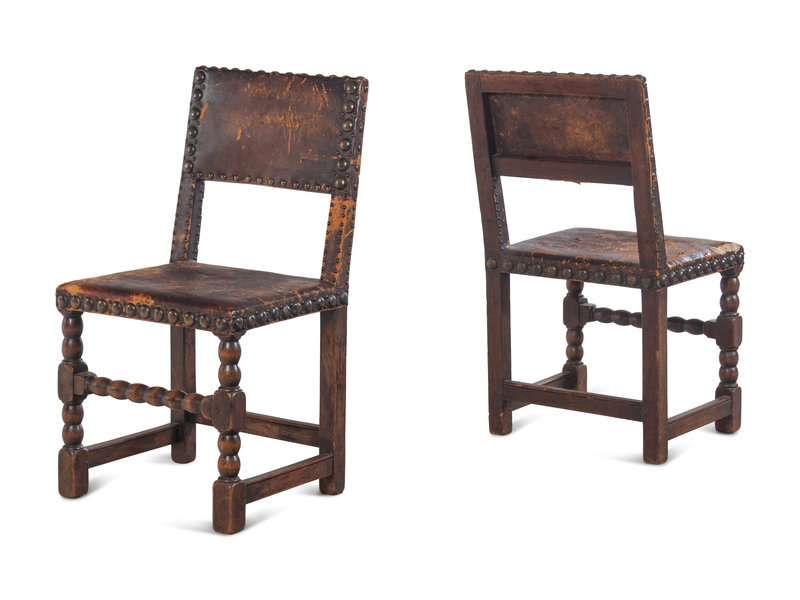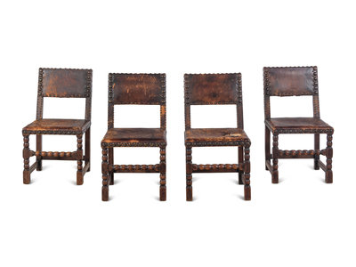 A Set of Four Spanish Baroque Style Oak Chairs with Leather Upholstery